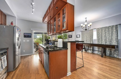 Perfect for families or large groups, this home has 3 bedrooms—two with king beds and one with a queen. There are 2 full baths and a half bath. The living area features a large sectional couch, lazy boy recliner, a 65-inch TV, shuffleboard, and an open kitchen with an island and 4 barstools, ideal for entertaining. The basement includes a pool table, darts, a 60-inch smart TV, and a washer/dryer. Outside, enjoy the patio with a fire pit, patio furniture, and a hot tub. Located in the heart of Ohio City, it’s just steps from great bars and a short Uber ride to Cleveland's hottest spots!