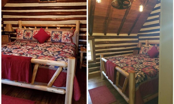 Almost Heaven Cabin sleeps 4 people and has (1) bedroom, (1) bathroom just RENOVATED with tub/shower, living room with futon sofa, full kitchen with refrigerator, stove, coffee maker, microwave, dishes, and cookware, (2) tvs, cable, wifi, private deck, a/c, gas fireplace, outdoor charcoal grill, outdoor fire pit, and electric furnace. No Pets! This cabin has parking for 2 cars. Boat/Trailer Parking & Additional Car Parking is available with advance notice.