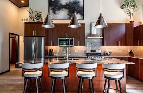 Our state-of-the-art kitchen is equipped with brand new appliances, sleek granite countertops, and a spacious island and large dining table- perfect for casual or formal dining. Whether you’re cooking a gourmet feast or a quick breakfast, you’ll find everything you need.