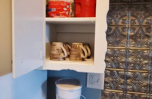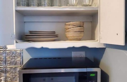 The fully-equipped kitchen has everything you'll need to make and serve delicious meals during your stay. Highlights of this space are the full-sized stove, oven, and fridge. The cabinets have ample room for storage and contain the basic cookware and dishes you’ll need.