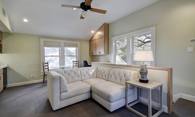 A light filled living room with views of the tree tops awaits you in this charming garage apartment. Sleep comfortably on the king size bed in the separate bedroom. Located in historic Old Enfield, this listing is perfect for a week-end or week long visit to Austin. Clarksville Restaurants and public transportation are within easy walking distance. Pease Park with its hike and bike trail to downtown is about a half mile away.