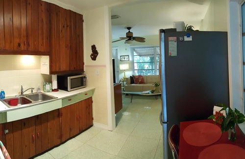 Our non-smoking home features two comfortable bedrooms with crisp, all-cotton sheets. Stylishly casual and colorful midcentury furnishings lend a peaceful air to this quiet getaway. Italian glass terrazzo floors reflect the Florida sunshine passing through classically styled awning windows. Catch a relaxing view of the river from the living room and glassed-in Florida room.