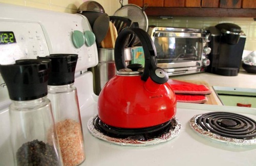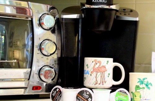 The charming nostalgic kitchen boasts the original custom-built Dade County pine cabinets and vintage Formica countertops, still in fine condition. We’ve also updated this fully stocked kitchen with modern appliances for the best of old and new. The cupboards store an eclectic array of retro tableware, lots of cookware, blender, Keurig and an automatic drip coffeemaker, and a large assortment of kitchen utensils. In fact, many of our guests have remarked on how well equipped the entire cottage is, to the extent that they say that all they need to bring on their next visit is a toothbrush and a few changes of clothes!