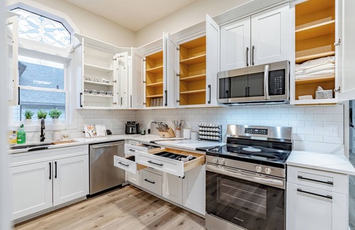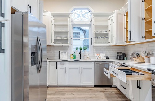 Additional amenities include a full-size washer and dryer, deck, a coffee bar, a wine fridge, upgraded bedding and mattresses, smart TVs, fast and reliable Wi-Fi, and keyless entry for your convenience.