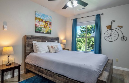 Your cozy getaway awaits in this second story apartment that sits above the garage with a private entrance all within walking distance to dining, shopping, and entertainment options at the Old Mill and Box Factory. This welcoming space features a private bedroom and a living room with an additional futon sofa bed for extra guests. Great table (seating for 4) for eating-in or doing work! Highlights include a smart TV, electric fireplace, fully equipped kitchen, EV Charger, private washer/dryer, small outdoor space with bistro set and private parking pad. All amenities you could need are included in this super charming apartment. And, a peek-a-boo view of Mount Bachelor.