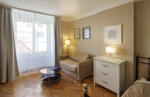 OLD TOWN-3 BEDROOM 3 BATHROOM TEMPLOVA is 110 m2 / 1184 ft2 total with 3 bedrooms with 3 bathrooms with 2 x shower, bathtub & fully equipped kitchen with dining table. Apartment blends homely comforts such as entertainment centre, bedding and work area with useful elements. As for attention and services the apartment is on level of a 3 - 4 star hotel. The apartment is suitable for short or extended stays and is on the 4th floor with an elevator. Oriented - street & courtyard.