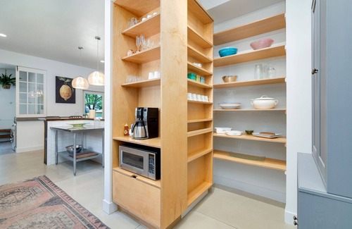 KITCHEN: The primary kitchen features a large center island, locally crafted walnut countertops and a butler’s pantry. It is fully equipped with stainless steel appliances, dishwasher, microwave, cooking basics, dishware/flatware, spices, complimentary coffee, creamer, tea and sweetener. There is also a secondary, fully-equipped kitchen in the basement!