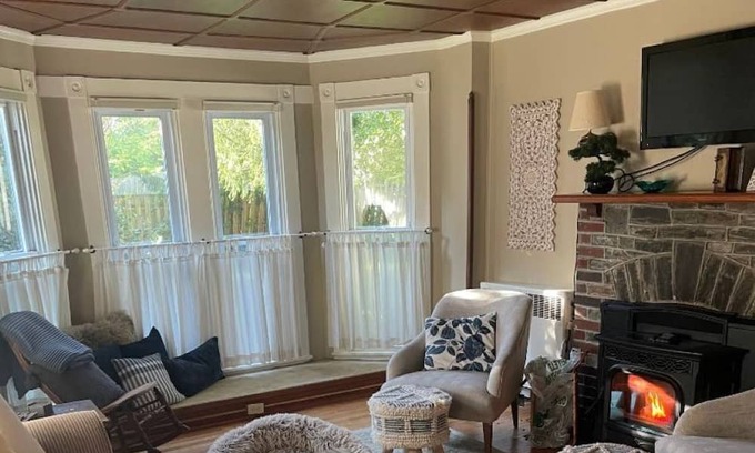 The indoor amenities include a comfortable living room with a pellet stove, sofa, chairs, and a TV. No smoking in the house. The open-plan modern kitchen has a breakfast bar able to seat 6 with a lovely reclaimed wood countertop. You'll have everything you need to prepare delicious meals and snacks during your stay. If you are not in the mood to cook. Speak to your hostess. She might be willing to whip up some pancakes or sausage gravy.