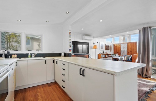 Stairs lead you down to the main hub of the home. This open-plan living space is furnished with the right mix of classic Kiwi beach bach appeal and modern conveniences of today. Enjoy year-round comfort from the heat pump, while staying connected via the Smart TV and WiFi. The fresh and functional kitchen will make cooking a breeze.