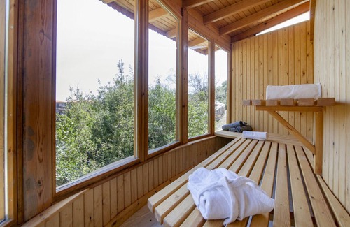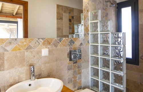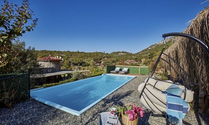 Return to nature when you holiday in Oleander Cottage, at the unique concept Yenice Vadi, in the southern province of Mugla, near the Mediterranean coast. Enjoy traditional Turkish life in this beautiful two bedroom villa, with panoramic views of the valley and village below. The cottage can comfortably accommodate up to five guests and would be ideal for a small family or group of friends’ sharing. Oleander Cottage is built out of natural wood and local stone, with classic whitewashed walls, and beamed ceilings. The property is set in its own garden with a private swimming pool, surrounded by lush green lawns, and indigenous trees and shrubs. Villa Oleander has dedicated parking spaces and complimentary air conditioning and Wi-Fi. The interiors are stylish yet homely, nature has been brought indoors, handcrafted furniture is made from local wood, and the décor is warm and welcoming, using a colour palette of crisp clean white and shades of sea blues. The ambiance is one of light and airy easy living, with floor to ceiling sliding doors that open onto the terrace. The seating area has a baby blue L-shaped sofa, that can be converted into a bed to sleep one guest, an enclosed wood burning fire, and a flat screen smart television. The adjacent kitchen is fully equipped with everything you will need to cater for your holiday. There are two beautifully-appointed bedrooms either end of the property, one with a king size bed, and ensuite bathroom with walk-in shower, and the other with twin beds, and a separate bathroom. The terrace has a covered veranda for shade, and is home to easy chairs and swing seats. The step-entry swimming pool is surrounded by wooden sun loungers and carved stone seats. Enjoy eating alfresco at the dining set, where you can feast from the fruit and vegetables you have foraged from the estate’s gardens and greenhouses.