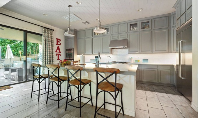 Olive Treeside is a luxury family home, professionally designed to inspire farmhouse living while enjoying all the modern amenities. It offers a yoga space, lounging pool, 2 outdoor living areas with fireplaces, grill and pizza oven. The neighborhood includes a basketball court, a playground, a park, and is minutes from grocery stores, restaurants, and the major highway.