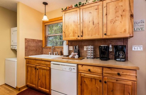 The living room boasts a vaulted ceiling and a stone fireplace to snuggle up in front of after a fun-filled day. The kitchen is open to the living area provides all you would need to cook some delicious meals.
