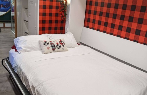 The queen size Murphy bed is cleverly hidden behind the couch pillows, maximizing space in this stylish and functional accommodation. For an added touch of magic, two twin size sleeping areas are located in the cupola, providing a truly unique experience under the twinkling lights and hand painted aurora borealis ceiling.