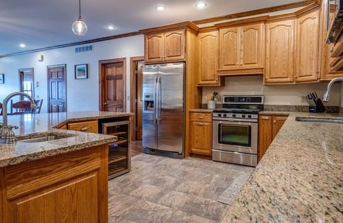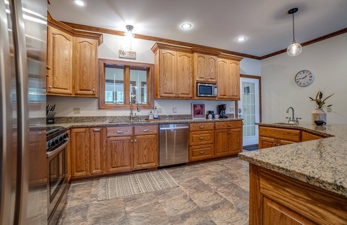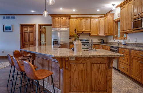 The upper level is so cozy with an open concept area that includes the Kitchen, Dining Room, and Living Room. The Kitchen has beautiful custom oak cabinets and a huge island (with small bar sink) for sitting up to on one of the leather bar stools or for meal prep. The Dining area is in the center of this common space and has seating for 8.