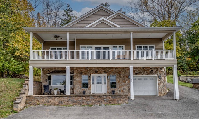 Across the street from the home, you'll find additional parking and the stairs to the lake. The lakefront areas were built in tiers and there is a large sun deck located between the parking area and the lakefront. From the sun deck, you'll walk down another short flight of stairs to the patio by the cabana and the lakefront. The cabana has a fridge and a small restroom, a great place to keep essentials if you're spending a whole day down on the lakefront. The patio has a small pavilion area with seating, along with a gas firepit. Just to the other side of the patio is the pebble beach for easy access of the lake...the perfect area for small children to wade in the water, put a kayak in, or for swimming. There is a large permanent dock and dock cleats for tying up a boat (the hoist is not available for guest use).