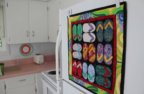 Living room includes an sofa and side chairs. Cottage kitchen with full size appliances, coffee maker, microwave, blender, mixer, toaster, tea pot and an assortment of bowls, pans cookie sheets and more. Storage for your own groceries