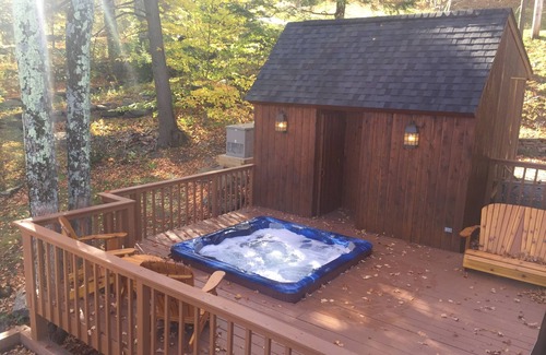 The living room is open to the kitchen and dining area in this open concept floor plan. Enjoy the comfortable leather sectional and kick back and watch some movies on one of two Smart TVs. If you really want to get cozy, relax by a nice warm wood burning fire upstairs or gas fire on the lower level. There are large decks off the main level and lower level. There are benches and Adirondack chairs so you sit comfortably with a spectacular view of the town and surrounding mountains. Enjoy the outdoor sauna and hot tub!