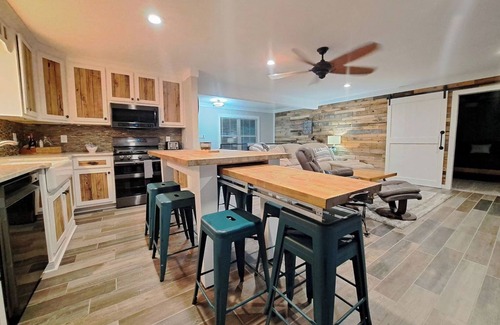 INDOORS: Open floor plan, river overlook, newly remodeled interior, rustic accents, Smart TVs, dining table with pullout for extra guests, full bar with wine/beer fridge downstairs, dart board, board games, books, and desk.