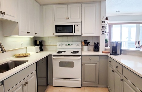 This home has a nicely appointed kitchen which was recently remodeled with new quartz countertops and updated cabinetry and hardware. The refrigerator/freezer has a water and ice dispenser. There is a dishwasher, microwave, electric range/oven/stove, as well as a toaster, electric griddle, coffee maker (both Keurig and drip), blender, hand mixer, pots & pans, bowls, cookie sheets, baking dishes and common cooking utensils are also provided.