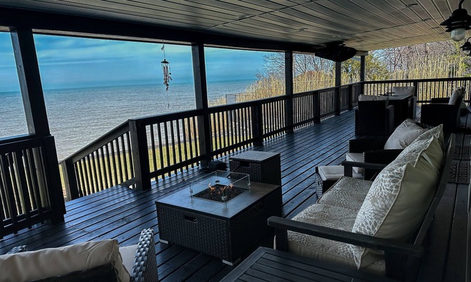 Lake living at its finest! Our Lake Erie oasis is decorated mid-century modern style. This spacious 5 BR (2 Lake Front) 3 Bath is conveniently located between Cleveland and Cedar Point. Large deck and cliff landscaped patio spaces offer spectacular lake and sunset views. Theatre to watch the big game and great for movie nights. Premium appliances and loaded kitchen!