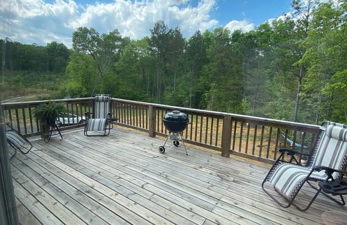 Come enjoy our Solar-Powered Bardominium on the Conasauga River with floor to ceiling windows, great fishing, hiking trails, and wildlife! Sleeps 6-8 with brand new, leather, living room couch, big screen tv and each bedroom with a tv. Indulge in the marble, double-headed master shower and another full bath with tub for soaking if you'd rather. Master bed has a wonderful view of the river and the 30 acre timber farm with its own deck! The second deck is off the kitchen with everything you'll need, including a charcoal grill. Watch the wildlife early morning and at dusk around the farm and on the river. FISH til you drop, with lots of different species in this area, or relax in the hammock or swing on the back porch. There is also a baby gate provided as well as a few toys, games, corn hole, a chalkboard wall and a fire pit great for roasting smores.