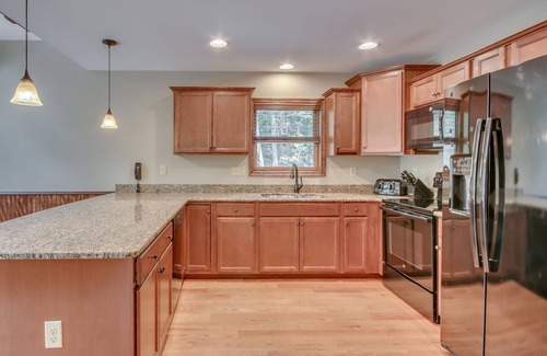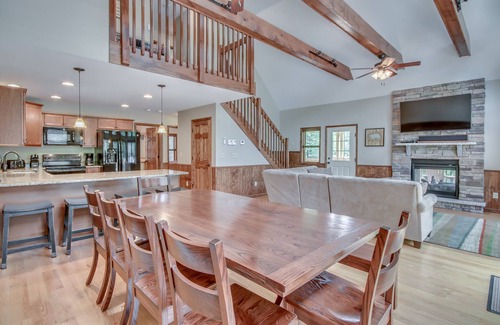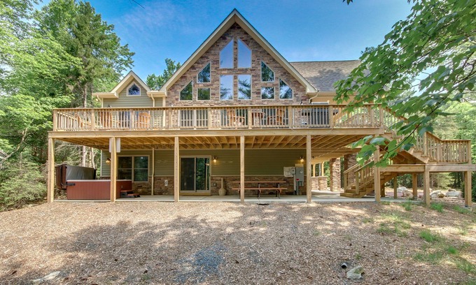On The Rocks is exactly that! The southwest corner of the property borders, and has direct access to, a 5 acre glacial boulder field just waiting to be explored. Built in 2016 and set in the private community of Lake Harmony Estates, this 7 bedroom, 5 bath home is full of desirable features for any group be it inside or out, summer or winter. There is a small private beach, marina, and lake access for fishing and boating. This lovely home is only a short drive to Big Boulder Ski Area or Jack Frost Ski Resort as well as a golf course, miniature golf, movie theater, bowling alley, arcade, Split Rock Resort's indoor water park, and dining options. Spacious covered and open decks with plenty of seating allow your group to barbecue on the always fueled and ready Weber grill and dine in the mountain air. Watch the shadows move across the boulder field from the 8 person hot tub, or just take a quiet stroll. Spend some time in front of the indoor/outdoor fireplace. Not the outdoor type? Particular attention was paid to the interior and the very comfortable furnishings therein. A soaring beamed ceiling and plentiful natural light add to the spacious feeling of the great room. The home's game rooms boast a 65” TV, a rustic log 8' Olhausen pool table, an additional 55” TV, a dry bar with mini-fridge, a Tornado T-3000 foosball table, and 4 player Dreamcade® Vision 40 video game with a 40” screen. All the TVs in the house are Smart TVs, and each bedroom has its own. We think you will agree that “being On The Rocks” can be a very good thing!