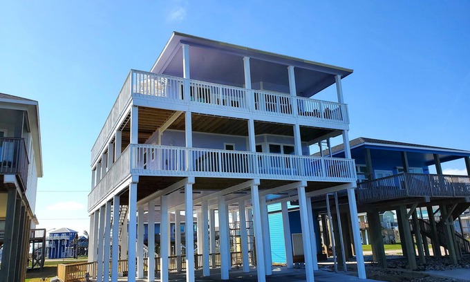She's done! We are doing the finishing touches between wine glasses, the elevator is installed, the hot tub just showed up, and the wifi is on! Most importantly the 75" TV and fireplace are installed! On The Rocks is a Brand New Luxury Ocean Front custom property with 5 bedrooms and four and half baths. The house is an upside down design with the kitchen, living, dining, half bath and one master bedroom (with on-suite) on the top level. First level has four bedrooms and 3 full baths. Three of the bedrooms are on-suites creating 3 master suites. Our goal is provide a self-contained resort type vacation with endless views and proximity to the beach. The house boosts a beautiful modern design with plenty of room to spread out and relax. The first deck has a 7 person hot tub over looking the Gulf of Mexico. The 1st deck is 1080 square feet, the 2nd deck is 980 square feet with one side uncovered for sun bathing above it all. Each bathroom is designed to have the Spa feel and feel of luxury, marble counter tops and thoughtfully selected tiles and colors to help you relax and enjoy a bath. Our yard is fenced so our our legged friends can run and explore and enjoy their vacation as well. Our house is situated next to the rocks at Treasure Island which has the most relaxing sounds of waves splashing in the rocks. It's truly a great vacation location. As a builder and having adjusted houses for multi-family rentals this house is second to none.
