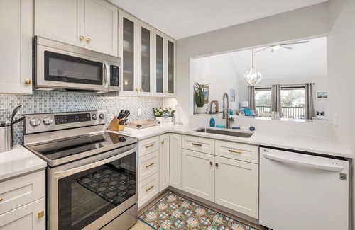 Upstairs you'll love the spacious living room with a separate dining room area and an open updated kitchen. There are spectacular views from the second floor! With family in mind, this townhouse offers lots of seating for a great movie, a fully stocked kitchen for simple to gourmet meals. The 2nd floor deck allows hours of outside time and no worries of mosquitos and no-see-ums because it is completely screened in. Unit 274 is located in a convenient mid-island location that puts you approximately 4.5 miles to the beach or pier-village-lighthouse area, and mere steps to one of the Island's favorite golf courses. You'll find it's an easy drive to the north end of the island as well.