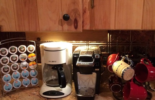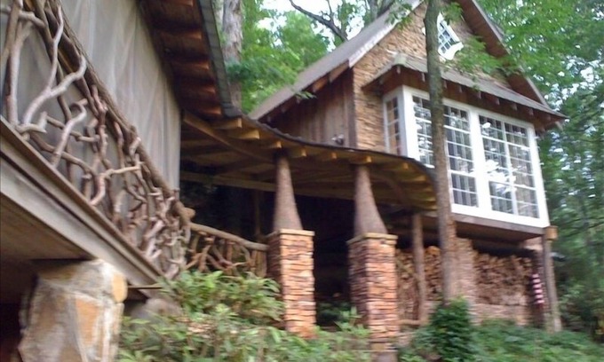 Up the hill from the main house is the two-story garage. A curving covered walkway lets you escape those mountain showers during loading and unloading your car when getting from the garage to the house. Above the garage is a separate, private queen bedroom and bath with shower; and there is a wonderful little porch with an Adirondak chair waiting for you.