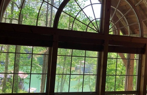 The main house itself has four bedrooms, each with a full bathroom. There is also a sleeping loft with twin beds. The original house has its own screened-in front porch and sitting area with a porch swing and rocking chairs, and also has the original wood-burning rock fireplace (there is a generous supply of wood stacked on the grounds). The 'new' part of the house has a large living room with gas logs in the fireplace, a spectacular dining room with a huge round table and its own fireplace with gas logs, galley kitchen, large master suite, a large wooden deck and a hot tub. There are views of the lake from the porch, deck, master bedroom, living room and dining room.