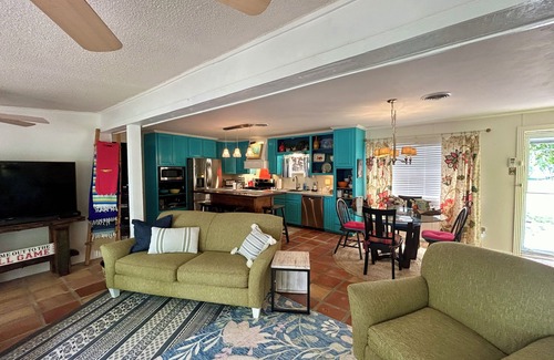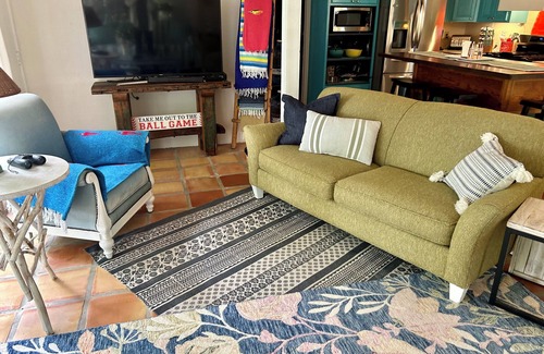 The home is decorated colorfully, reminding one of the culture in nearby Mexico. The turquoise kitchen has an island that seats 3, and a dining table can accommodate another 4-5 guests. The living room is bright, with colorful Mexican blankets draping the furniture. Relax and unwind in your comfortable and relaxing vacation surroundings.