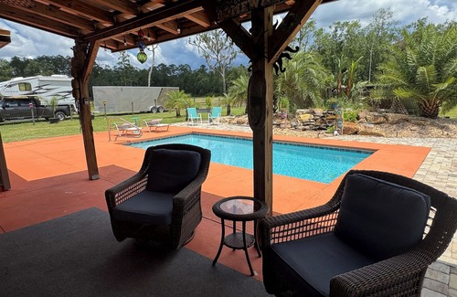 Welcome to our charming three-bedroom, two-bath farmhouse in the heart of Central Florida. Set on peaceful farmland and surrounded by nature, this cozy retreat features a private pool—perfect for cooling off on sunny Florida days. With its rustic charm, open skies, and room to relax, our farmhouse offers the perfect blend of comfort and country living for families, couples, or anyone looking to unwind and reconnect.