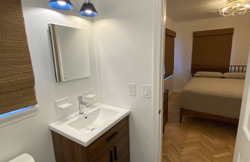 Central air throughout, ceiling fans in all rooms, custom closets for storage and room darkening shades in the bedrooms. This thoughtfully appointed single-family home offers one-floor living with private parking. It's streamlined layout allows you to enter through the living room or eat-in kitchen. The living room is outfitted with a queen sleeper sofa and sleeper loveseat.