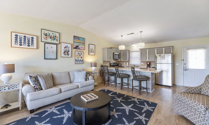 Step into comfort and style in this newly redecorated and refurbished one-bedroom condo featuring stunning lake views. Enjoy the elegance of luxury vinyl plank flooring throughout the kitchen, living area, and bathroom, complemented by plush, memory foam–padded carpeting in the bedroom. Relax on a comfortable king-size bed while watching your favorite shows on a ROKU flat-screen TV. The fully equipped kitchen showcases freshly painted cabinets, while the living area features a cozy gas fireplace and a 55-inch flat-screen TV. The bathroom is beautifully updated with a granite countertop and vessel sink. This non-smoking, pet-free condo is the perfect lakeside retreat—your little slice of paradise awaits.