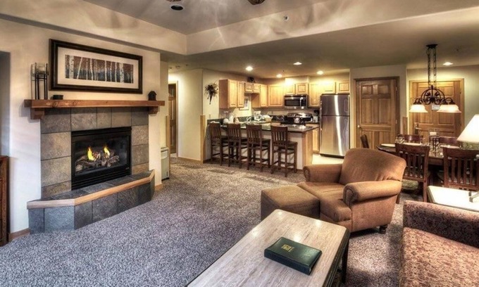 Resort living at Grand Timber Lodge at the foot of the Breckenridge Snowflake ski lift. Amazing hiking trails from the property. Two indoor/outdoor pools with multiple hot tubs and kids play area and splash pad. Unit has one master bedroom with a king bed, dining area and fully equipped gourmet kitchen. There is a living room with a gas fireplace and queen sleeper sofa, a private deck with stunning views, washer/dryer and master bathroom with Jacuzzi tub.