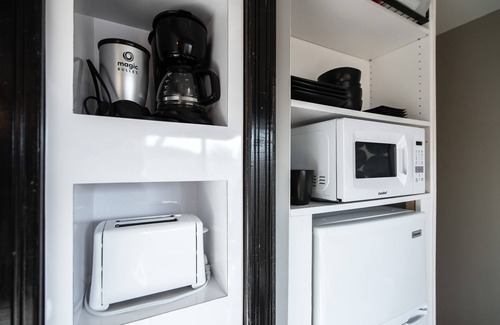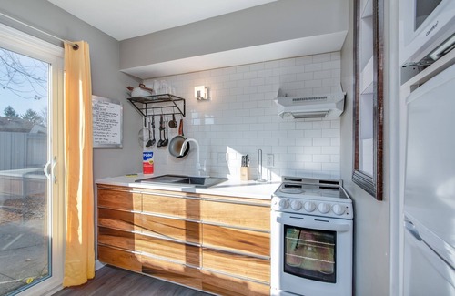 The bedroom is bright and cheerful and can be easily darkened with blackout drapes (not pictured.) A teal focal wall and upholstered headboard add style to the peaceful room. You'll love sinking down onto the plush queen-size memory-foam bed to catch some zzz's. The ensuite bathroom has a modern bowl sink, marble-topped vanity, and a tub/shower combo.