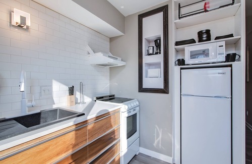 The living area is crisp and modern, but completely comfortable too. A navy blue sofa with a chaise and a comfy gray armchair face the flatscreen television. Contemporary touches— like the coffee table and artwork— compliment the clean space. It's the perfect spot to unwind after a long night or sip your coffee and watch TV before starting your next shift. There's even a small, built-in desk space for getting a little work done. Super-fast WIFI (100MBPS) is available throughout the condo.