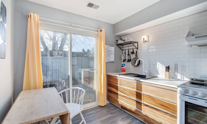 In the custom kitchen, sleek wood cabinets, a granite countertop, and a classic subway tile backsplash create an efficient workspace to whip up a snack, brew your coffee, or fix a meal before hitting the sack. Built-in shelving houses all of the small appliances— like the coffeemaker, microwave, and toaster oven— cleanly and conveniently. Around the corner, a high-efficiency washer and dryer can handle all of your laundry with ease. Outside through the patio doors is a small, sunny, private, fenced-in yard. A Quiet and Peaceful Sleeping Space