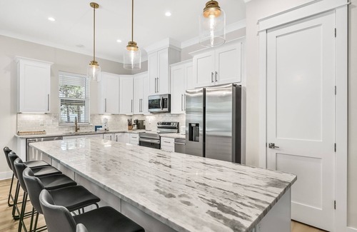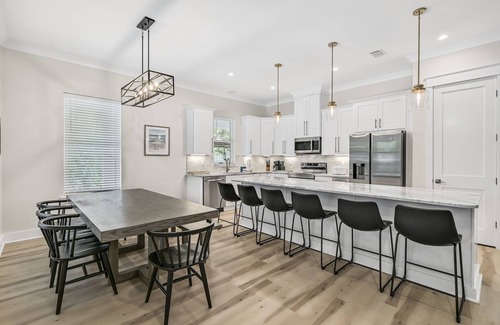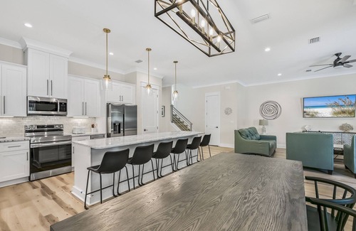 Experience the ultimate beach getaway at Ahoy Matey, a newly constructed luxury retreat in the gated community of Emerald Waters Village. The 5 bedroom, 4.5 bathroom beach home is outfitted with coastal décor, high end finishes, and can accommodate up to 14 guests.