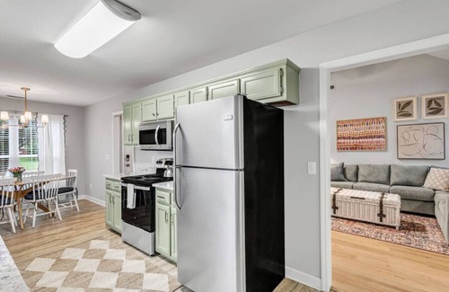 When you walk through the front door, you enter a spacious living room with vaulted ceilings, comfortable seating, and a Smart TV. To the right, you’ll find the kitchen and dining area, perfect for cooking and gathering. The washer and dryer are tucked away in a closet just off the kitchen for your convenience.