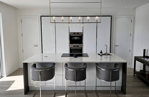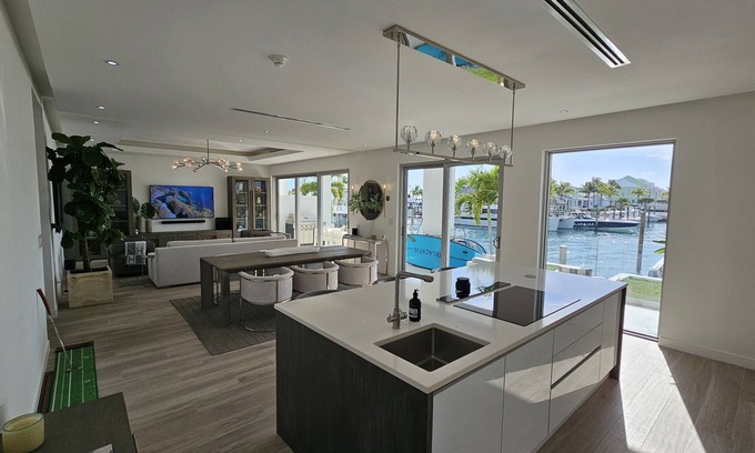 The main area of the home is wide open, with a beautiful view of the marina. The entire home has motorized shades. All the furniture and lighting is from Restoration Hardware. Everything is included from pots & pans, glassware, dishes, utensils, towels, etc. You will be staying in a 100% turn-key home. A water filtration system is installed. The entire home is on a generator. All the sports equipment is included in your stay.