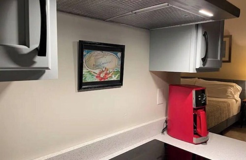 Unit 4 Anoush Suite is a studio, with a full kitchen includes a cooktop, refrigerator, microwave, toaster, coffee pot. High ceilings help make this place feel large and airy. This unit has modifications to make it easy to use a wheelchair.