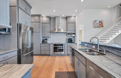 Inside, the home features a spacious and impeccably appointed kitchen with modern appliances including a refrigerator, drip style coffee maker, dual microwaves, dual dishwashers, stove, toaster, and oven. The kitchen island invites you to prepare and enjoy gourmet meals together. The living room is a cozy retreat with a smart television, and cable. Free WiFi is available throughout the house. For ultimate convenience, large washer and dryer sets are available on two levels of the home.