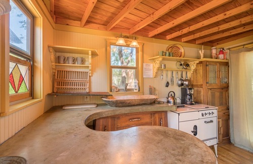 This uber-unique eco cabin was crafted from a vision by environmentalist architect Marley Porter (One World Theater) in Austin. It comfortably sleeps 2 people in the loft bed, and can accommodate up to 2 additional people with a full-sized convertible sofa bed in the living area. Stonehouse Vinyards Winery is within walking distance, and Krause Springs spring-fed swimming hole is just up the street!