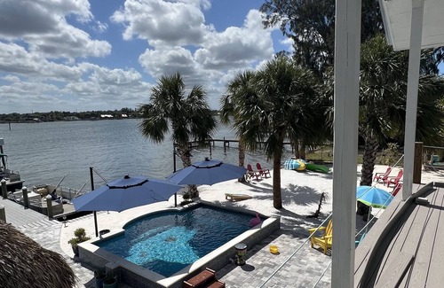 Private island pool home that will wow you from the moment you arrive. Sunsets of the Indian river provide the back drop for this completely remodeled 3 story riverfront paradise. Amazing views, heated pool, hot tub on the deck overlooking a tropical tiki hut with white sand beach all for you private get a way. Big screen TV, gourmet kitchen, Wi-Fi, dish TV and much more provide the vacation of a life time. NOTE: this is a boat access only property from our private dock and parking area. Bring you own or rent one and have it waiting for you at the dock.