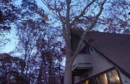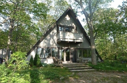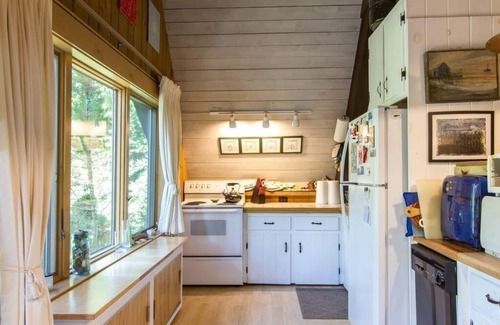 The floorplan offers a first floor bedroom with a king size bed and full bath, large common room with walls of windows bringing the beautiful woodsy outdoors right inside. The open kitchen area has a standard stove, large refrigerator, dishwasher and sink with plenty of counter space for preparing meals. There is also an outdoor gas grille and picnic table. Up the spiral stairs to the second floor, you'll discover two large bedrooms, one with a set of twin beds, the other, a queen. Both bedrooms have high ceilings, tall windows and wonderful views of the private grounds.