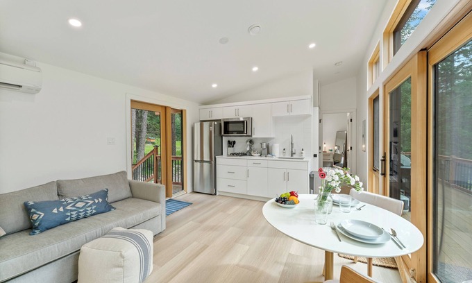 This remodeled, cozy cabin offers 685 square feet, two bedrooms, and one bathroom to accommodate up to two guests. You'll take some exterior stairs to the front door and into the main living area, with the sitting area and kitchenette. The living room space offers a queen-sized sleeper sofa, a 55” Smart TV, and a bistro table with seating for two. The kitchenette is well equipped and comes with a refrigerator/freezer, two-burner stovetop, Keurig coffee maker, Microwave/convection oven combo, plus utensils that will let you create delicious meals and snacks. The deck is spacious and offers patio seating and table, a propane BBQ grill, and gorgeous surrounding views.