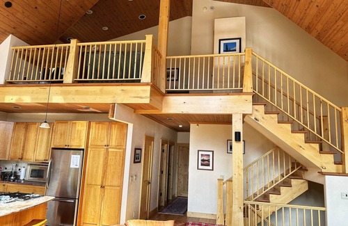Lower level you will find a garage for 1 vehicle, ski closet, room with bunk bed (single bed on top of a queen bed), a small sofa with a TV and en-suite bathroom. Middle level a beautiful deck with a great view, large living room, fire place, TV, dining table and Kitchen. Two large rooms with queen bed each, shareable bathroom in hallway, and a laundry room. Upper level you will find a work place and primary bedroom with King bed and a spacious en-suite bathroom.