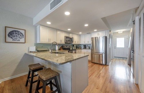 ONE step to the beach from this gorgeous Beach condo with 2 bedrooms and 2&1/2 bathrooms. Equipped with a sleeper sofa and can easily accommodate 6 guests. Enjoy sunsets from all three levels. Enjoy your morning coffee or evening cocktails from the balcony off the Master Bedroom. Dine practically on the beach with ground level patio or watch the kids play on the beach as you sit and relax from 2nd floor balcony. Enjoy endless walks on the beach and many restaurants are within walking distance. Beach towels, chairs, toys, and umbrella are available for use so all you need to pack is a swim suit and sunscreen!! Also has two desks if you need to work while vacationing! High speed wireless and wired internet for your convenience. Cable tv and Firestick to watch everyone’s favorite shows from three TV’s! Comes with 1 designated parking spot. Conveniently located only 10 miles from St Pete/Clearwater Airport and 23 miles from Tampa international airport. Don’t miss the opportunity to make family memories at Beach Blues!!