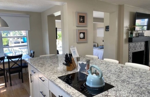 Sophie's has been completely remodeled. Welcome to Sophie's Cottage, a peaceful waterfront retreat. The cottages is a vacation place for families or a romantic getaway for couples. There are 2 bedrooms and 2 bathrooms: 1 king bed, 1 queen bed, two sleeper sofas, 1 queen and 1 full size, both have gel foam mattresses. The dining room, living room and den all make a cohesive space for entertainment or relaxing. Step out back to a paved patio, private heated pool, and view of the canal. The patio area has ample seating, and makes a great place for entertainment or outdoor dining. The front porch is screened in for privacy. The cottage is within walking and biking distance to the beach and the Siesta Key Village. Sophie's Cottage gives you easy access to vibrant local attractions, shops, restaurants and relaxing days on the beach. Whether you spend your days wandering through the shops or enjoying the beautiful beach, you will have a tranquil retreat to return to at the end of your day. Beach chairs and tables, 3 bikes,3 kayaks, 2 yoga mats and a gas grill for cookouts are included.